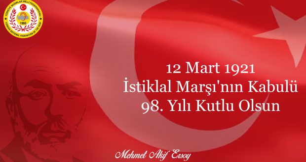 12 MART 1921 İSTİKLAL MARŞI’NIN KABULÜ 98 YILI KUTLU OLSUN Yazar: admin Kategori: 2019 Haberler, Haberler, TSMF FAALİYETLER 12 Mart 2019 0 260 Görüntülenme 2019-03-12 admin tweet
